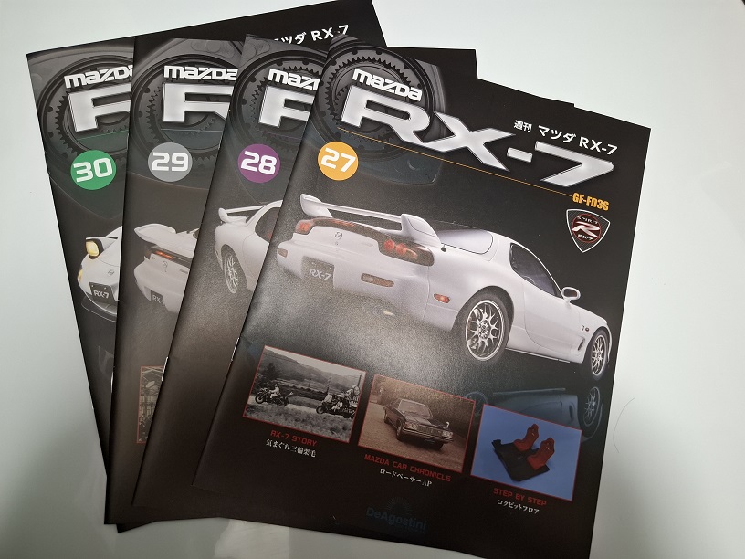 第28号では、センターコンソール、サイドブレーキ、シフトレバーグローブ、フロアマット、ABCペダルが付属されてきました。これらの部品と前回までに製作していた部品を合体すると写真のようなコクピットが出来上がります。