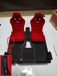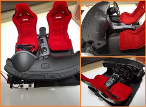 フューエルレバーのような小さな部品も写真のように細かくデザインされています。フロアマットも特殊な塗装がされており、若干フワフワ感があり、本物さながらになっています。